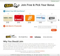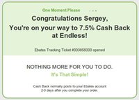 При первом заходе на сайт Вы увидите окно, в котором необходимо выбрать бонус за регистрацию, которых Вы хотите получить (рекомендуем выбрать пункт "EBATES") и ввести свой адрес электронной почты. При первой регистрации на Ваш счет будет зачислена сумма в 5$. Т. е. Вы еще не начали покупать, но уже заработали!